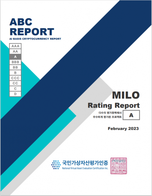 국민가상자산평가인증은 Milo 프로젝트가 제출된 자료를 기반으로 ▶ AI 기반 데이터 수집 ▶ 제출 서류에 대한 검토 ▶ 실사 및 인터뷰를 진행했습니다. 총 25 개 부분을 평가하여 100 점을 만점으로 71 점으로 평가되었기에 ‘다수의 평가 항목에서 우수하게 평가된 프로젝트’로 판단하여 ‘A’등급을 부여합니다.
