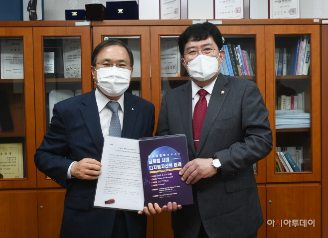 | 선상신 국민가상자산평가인증 대표(왼쪽)가 25일 국회 윤창현 의원실에서 윤 의원에게 ‘정책 제언집’을 전달하고 있다. 국가평은 지난 7일 ‘윤석열 정부에 바라는 글로벌 시대 디지털자산의 미래’라는 주제로 세미나를 개최하고 각계 전문가들의 의견을 모아 이날 윤 의원에게 전했다. /정재훈 기자 hoon79@ |